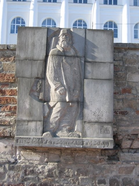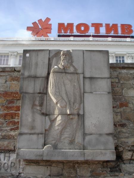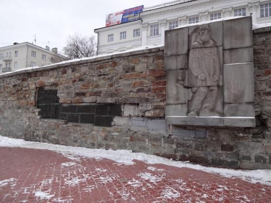 Памятник первому строителю города. Рядом расположена стена в память о начале сооружения горного завода.